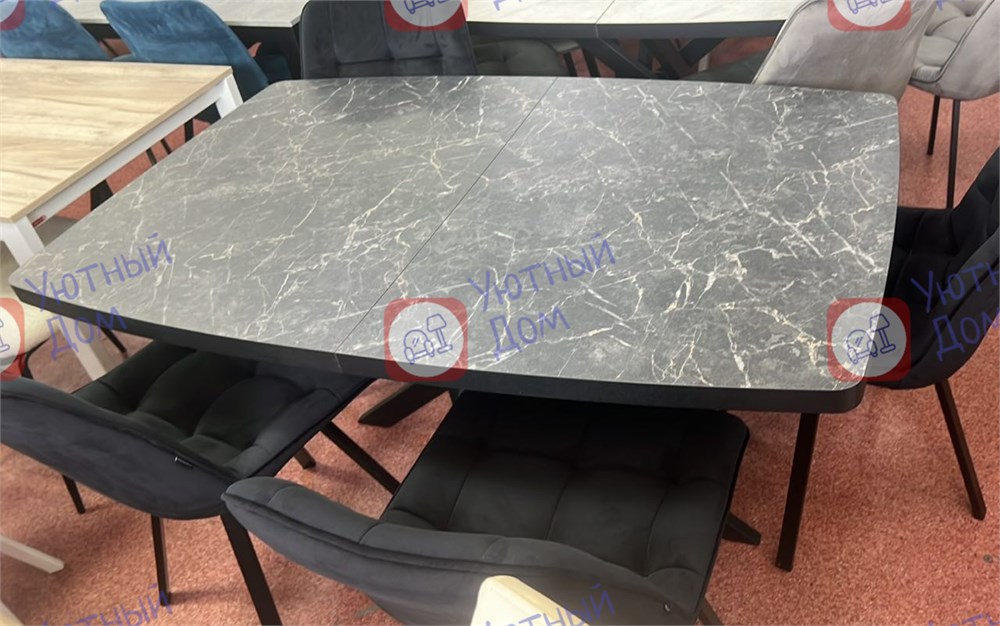 Стол 140*90(40), 43500 Чёрный металл/чёрный мрамор Стул мягкий поворотный чёрный велюр , 12200/шт